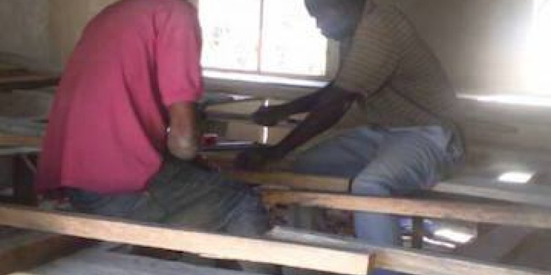 Les trois pièces du Centre Communautaire (salle de réunion, bibliothèque et salle multimédia) sont maintenant équipées de leurs plafonds en bois contreplaqué.