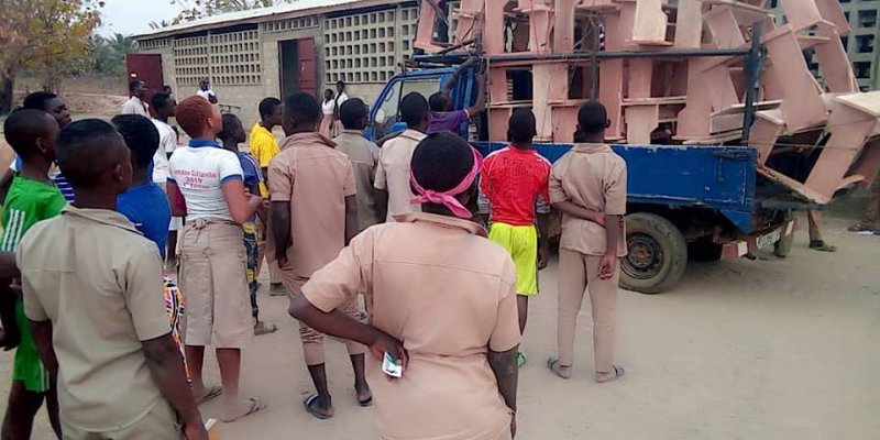 About twenty tables and benches have just been delivered to the college community. Lots of people at the arrival of the delivery truck: the Director, the t…